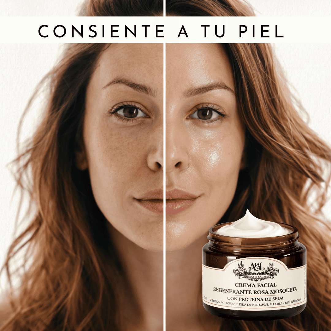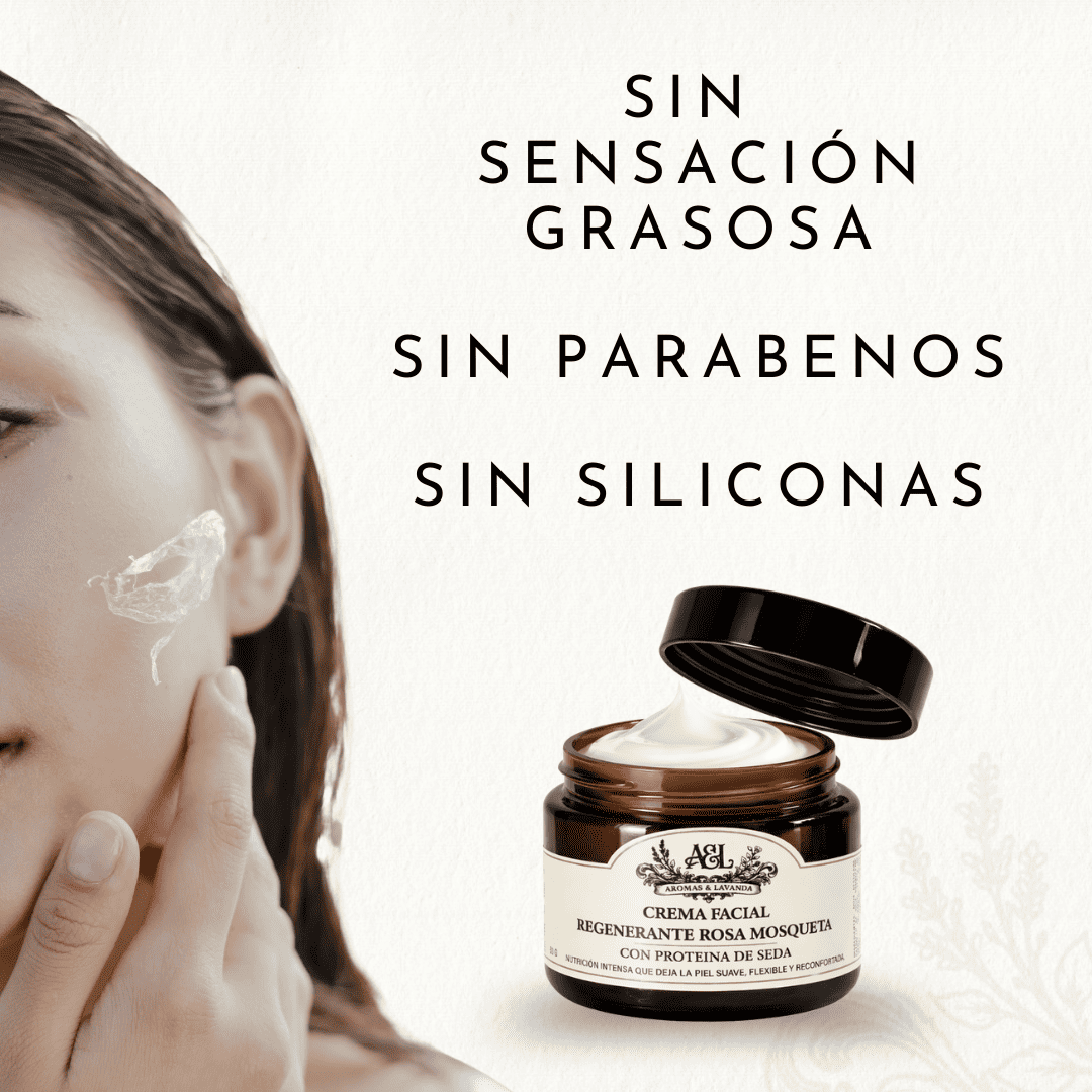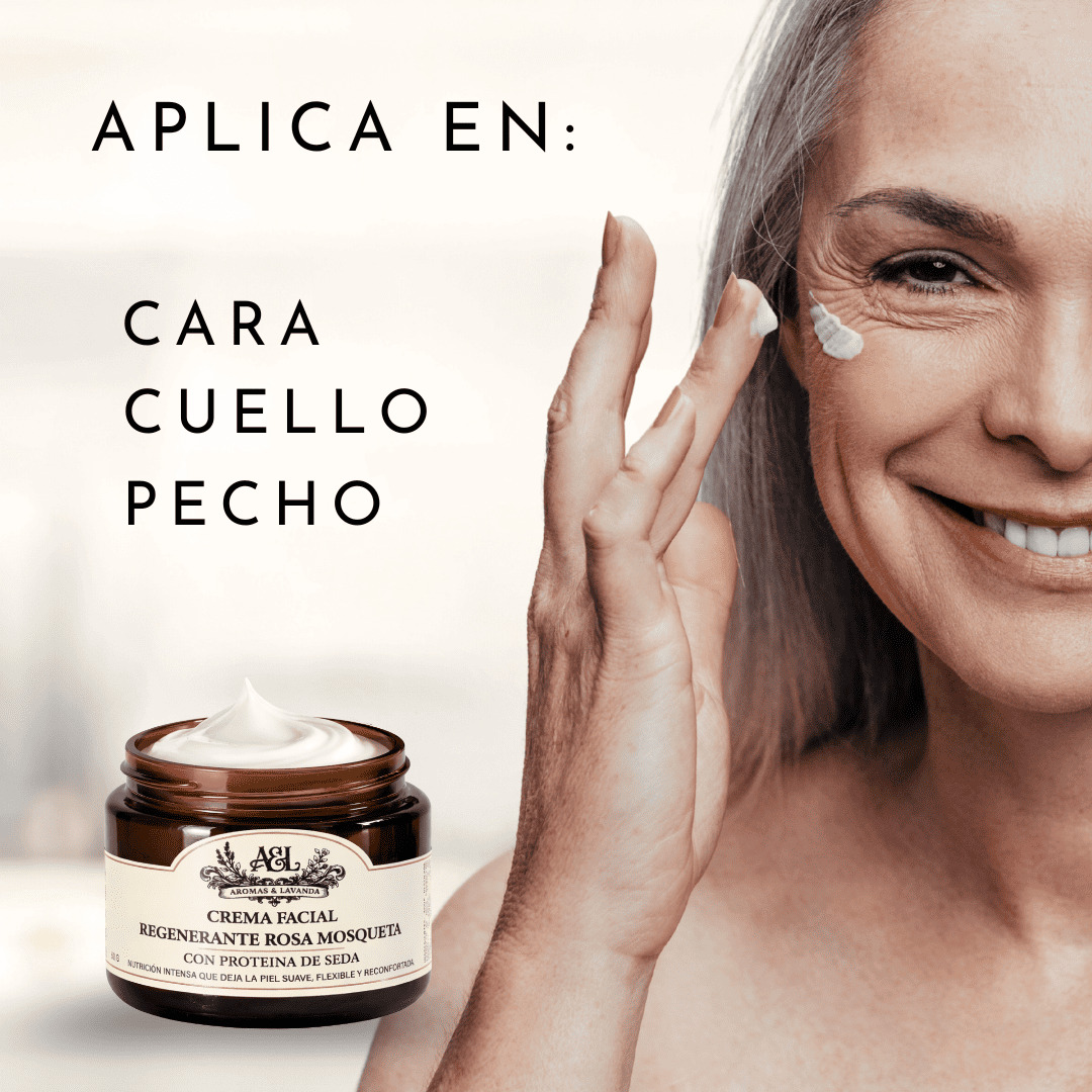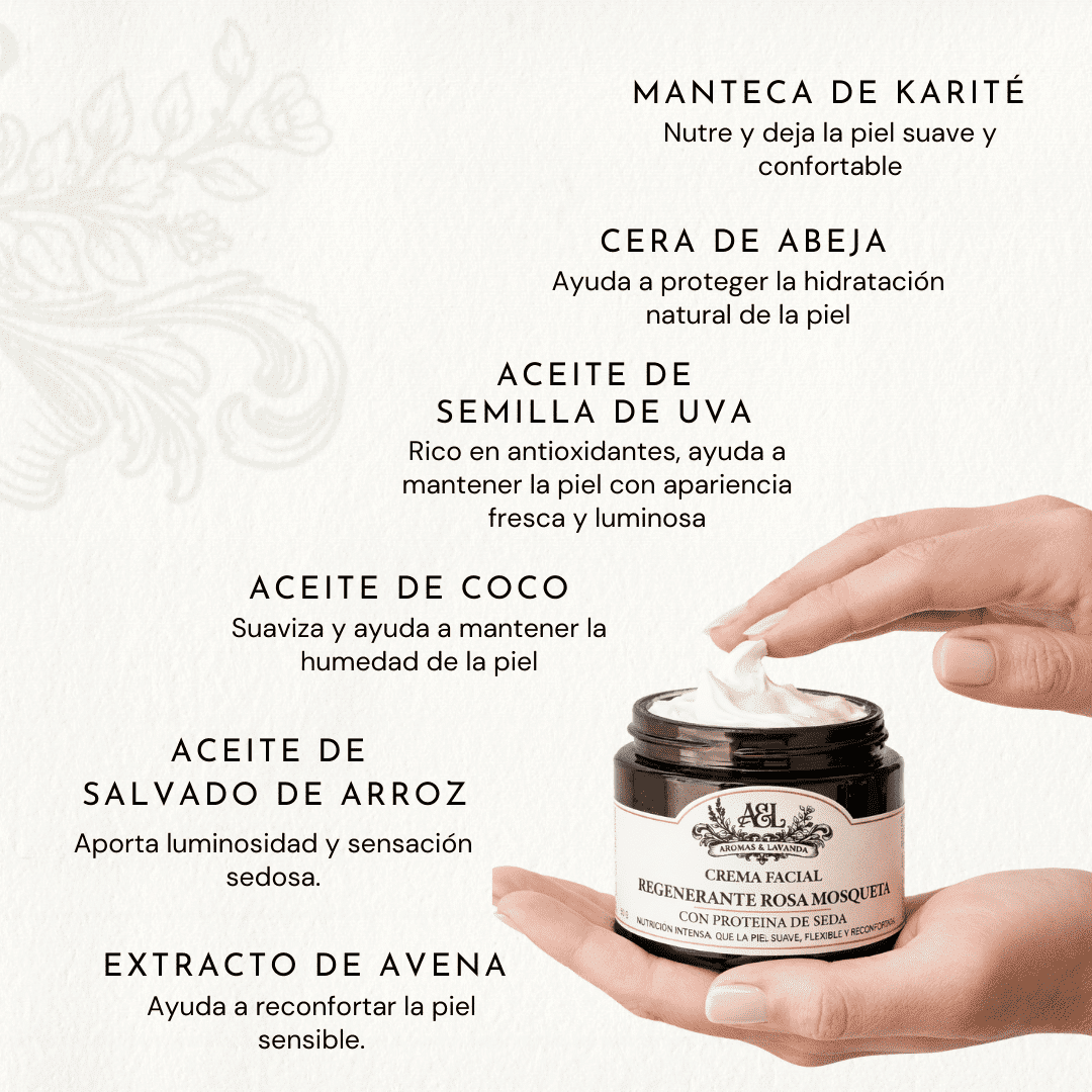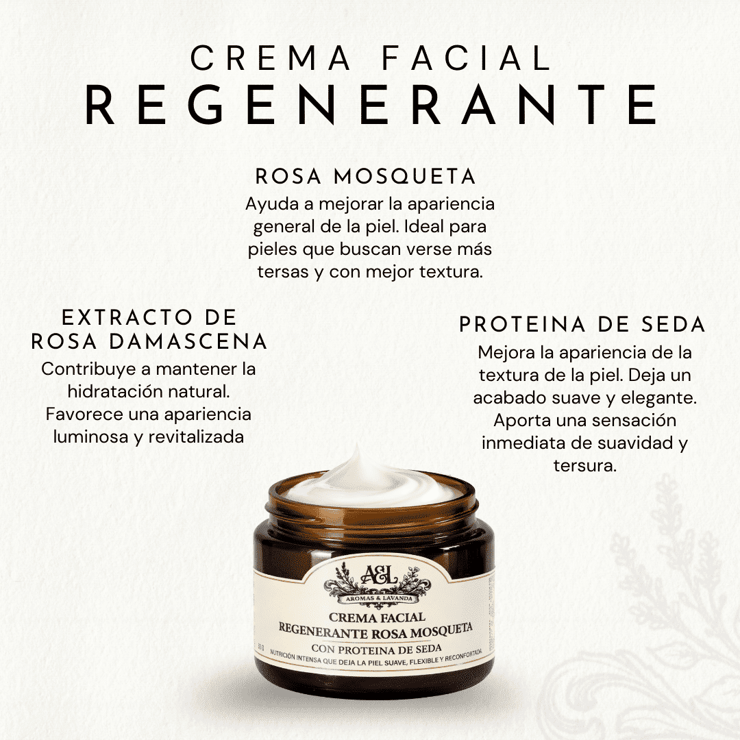 La Crema Facial Regenerante Rosa Mosqueta de Aromas & Lavanda es una fórmula premium elaborada artesanalmente en pequeños lotes, pensada para nutrir, suavizar y mejorar la apariencia general del rostro.